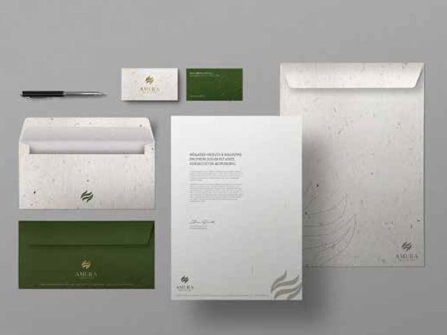 El sistema visual se enriquece a través de texturas y materiales inspirados en arena, agua y elementos minerales, lo que suma una dimensión sensorial a la marca. Cada aplicación —papelería, espacios físicos o activaciones— fortalece esta narrativa, consolidando a Amura como un desarrollo exclusivo, envolvente y profundamente enraizado en su entorno.